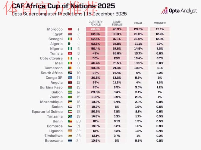 非洲杯新格局 摩洛哥领跑夺冠概率的背后逻辑 非洲杯向来被认为是充满变数的洲际赛事,但在当下的数据时代,情绪与传统印象正逐渐被理性分析所取代。当权威数据机构 Opta 公布最新的非洲杯夺冠概率后,